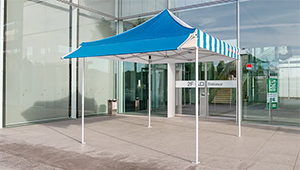 サイズは、2.0m×2.0m、3.0m×3.0mの2種類。バナーにもなる3段階調整可能オーニング付。